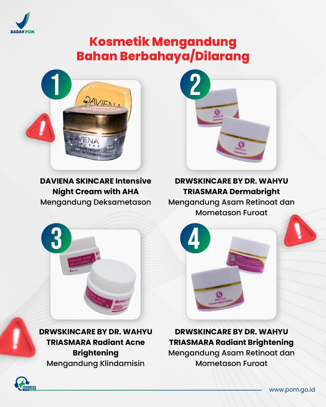 - DRWSKINCARE DR. WAHYU TRIASMARA Radiant Glow: mengandung asam retinoat dan mometason furoat (nomor izin edar dibatalkan)