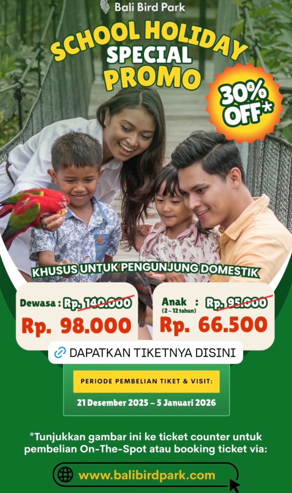 Bali Bird Park buka mulai pukul 09.00 sampai 17. 30. Harga tiket untuk wisatawan domestik saat ini sedang ada diskon 30% yaitu harga tiket anak-anak sekitar Rp66.500 sedangkan harga tiket orang dewasa Rp98.000.