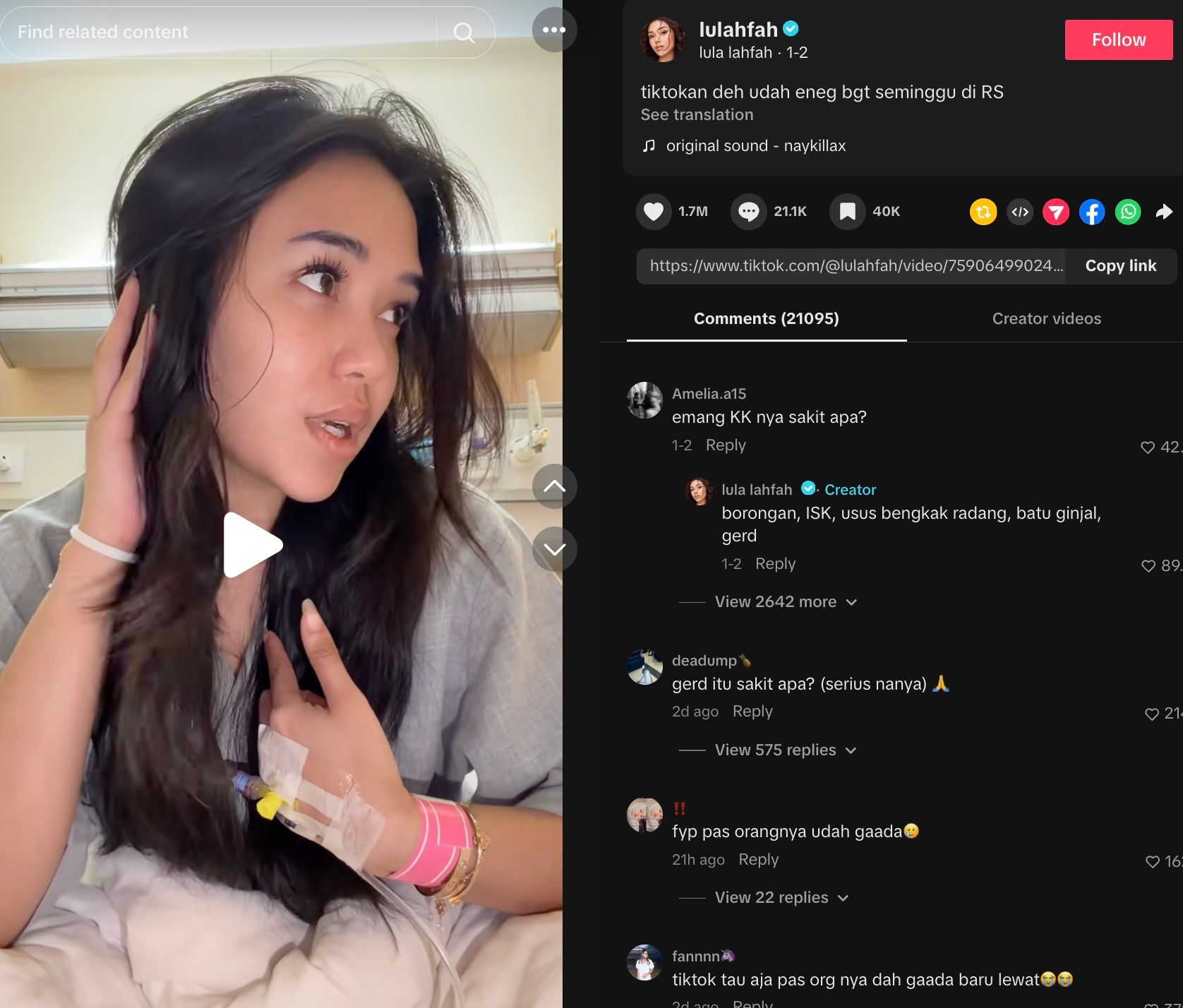 Akun TikTok Lula Lahfah sebelumnya juga sempat memberi penjelasan tentang kondisi kesehatannya. Mengutip jawaban yang diberikan akun TikTok Lula Lahfah, mengatakan bahwa selebgram berusia 26 tahun tersebut mengalami ISK, usus bengkak radang, batu ginjal, dan GERD.