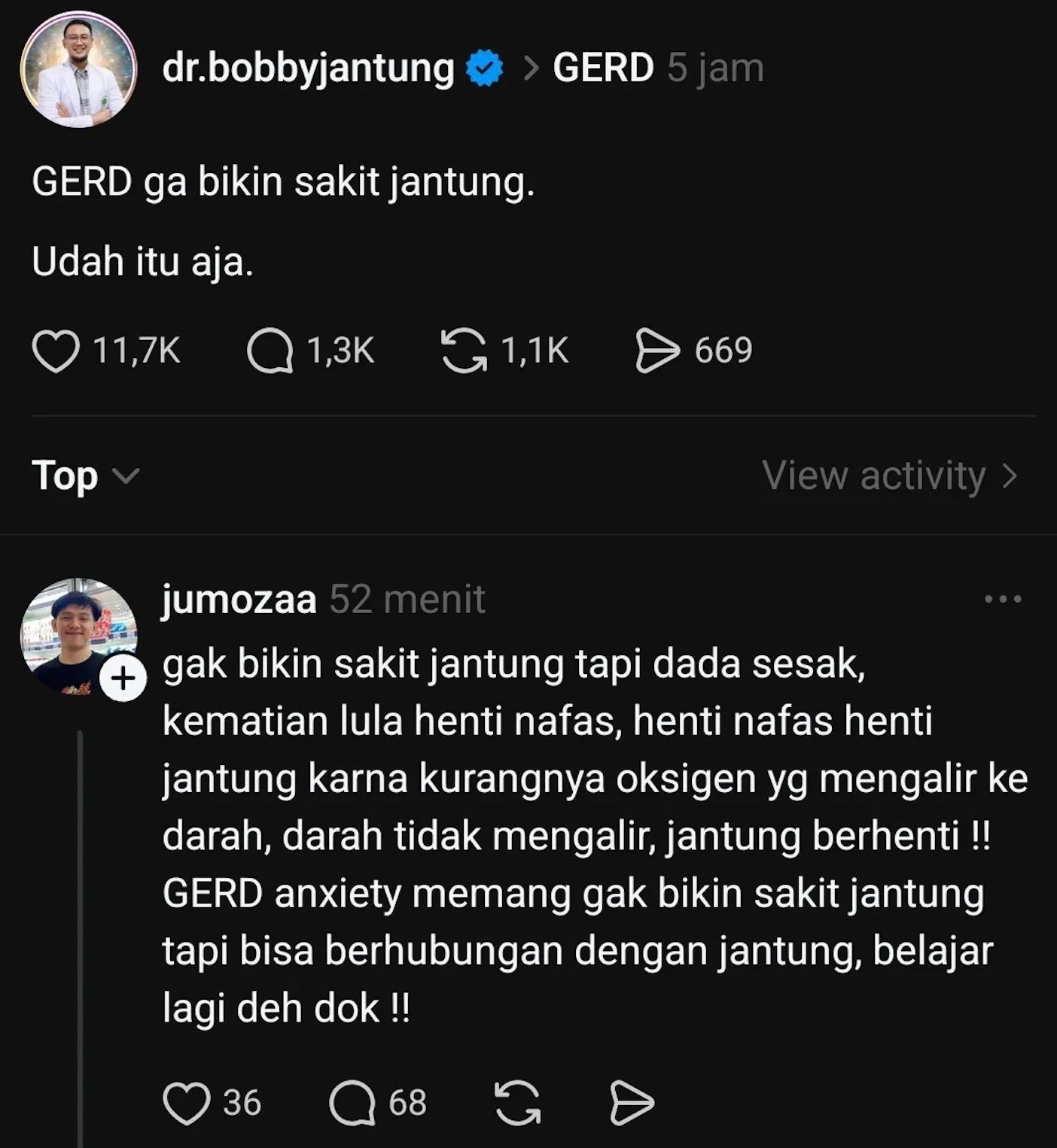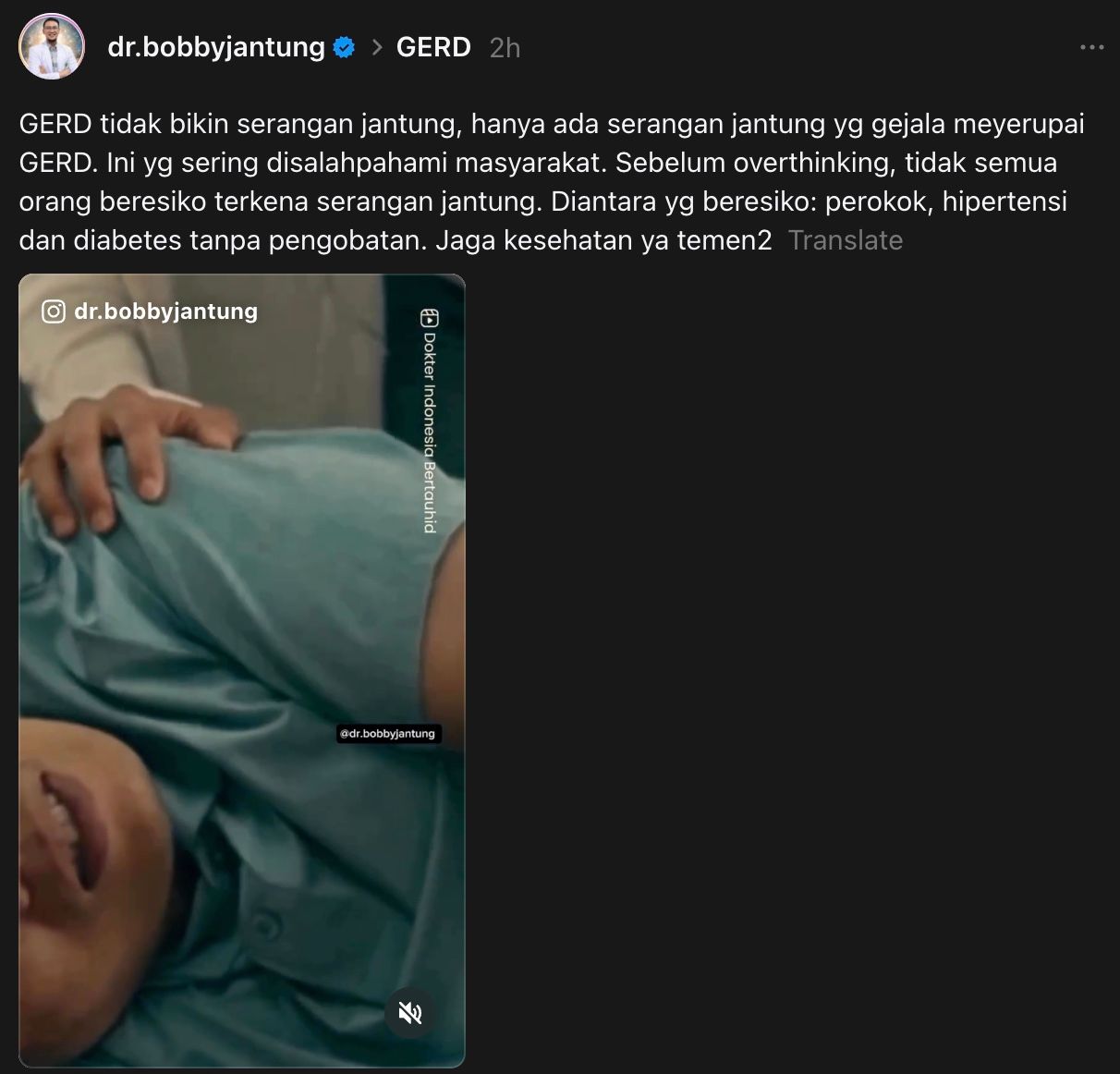 Dalam media sosial Threads-nya, dr.bobbyjantung atau dr. Bobby Arfhan Anwar SpJP(K), ini menegaskan bahwa GERD tidak menyebabkan serangan jantung, yang ada adalah serangan jantung yang gejalanya menyerupai GERD dan hal inilah yang sering disalahpahami oleh masyarakat.